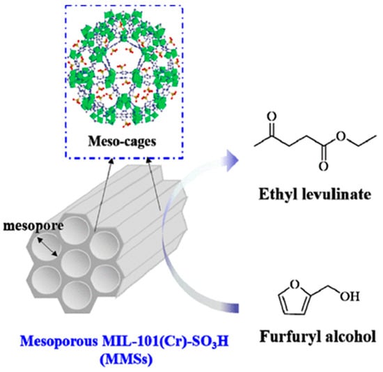 P. Neves et al. tested various aluminosilicate acids exhibiting different acidities and porosities in the alcoholysis of furfuryl alcohol with ethanol [37]. Among them, Al-TUD-1 obtained the highest ethyl levulinate yield despite its relatively lower acidity (Table 2, entry 8). As the aluminosilicate exhibited the highest specific surface area, it was proposed that the accessibility of the active sites to the reactants played a dominant role in the efficiency of the catalyst in the formation of ethyl levulinate. In the development of sulfonic acid-functionalized SBA-15, P. D. Carà et al. used a template agent to enhance the accessibility of the active sites to reactants [38]. In the alcoholysis of furfuryl alcohol with n-butanol, the catalyst exhibited 96% selectivity toward n-butyl levulinate at complete conversion (Table 2, entry 9) [38]. X. Liu et al. developed mesoporous metal–organic frameworks (MOFs) because of the limited diffusion and mass transfer of reactants in most microporous MOFs (Figure 3) [39]. The walls of the mesoporous materials, MIL-101(Cr)-SO3H (MMSs), were composed of crystalline microporous frameworks. When utilizing a series of MMSs for the alcoholysis of furfuryl alcohol with ethanol, MMS(0.3)-0.15 with a moderate pore size and Brønsted acid density of -SO3H displayed the highest catalytic performance (83.8% ethyl levulinate yield at full conversion; Table 2, entry 10).