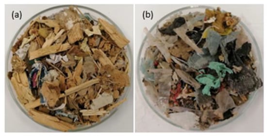 Figure 1. Raw wastes: (a) RDF-L and (b) RDF-P.