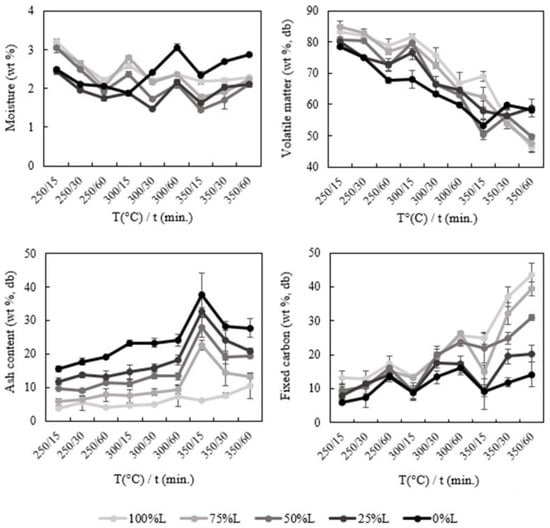 Regarding the proximate composition of the chars (Figure 2), a reduction of moisture and the volatile matter is observed in comparison to the raw waste since the torrefaction/carbonization process eliminates volatile organic molecules, concentrating the condensed carbonaceous structures, which makes the chars more hydrophobic [33]. The increase in moisture under more severe carbonization conditions must be related to the elimination of volatile compounds that were retained in the biochars after the carbonization process [34]. The increased hydrophobicity of the chars, when compared to the raw wastes, is also desirable since it reduces fuel degradation by oxidation or microbes and requires less energy to evaporate moisture [35]. On the other hand, the volatile matter reduction on the chars may bring some issues regarding temperature stabilization during the gasification process [36].