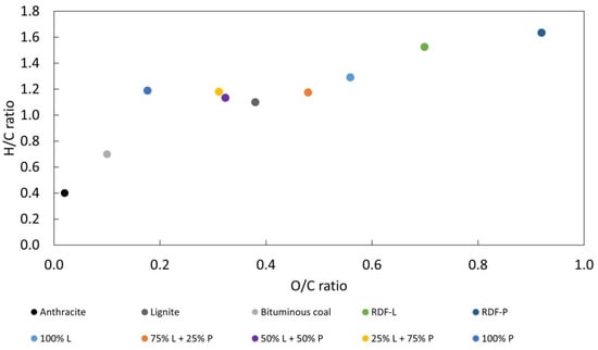 The highest alteration observed in the constitution of the chars is related to the concentration of oxygen, which gradually decreases with the increase in the incorporation of RDF-P. The concentration of this element in chars ranged from 38.1% in RDF-L samples to 13.3% in chars samples produced from RDF-P. Consequently, chars presented lower H/C and O/C by the devolatilization of some hydrocarbons and oxygenated volatile compounds, which led to an improvement in their fuel properties. Moreover, and in general terms, one may observe a relationship of inverse proportionality between O/C and H/C ratios with the HHV measured for all chars, as presented in other works [38]. Figure 3 shows a Van Krevelen diagram of the raw wastes and biochars produced at 300 °C for 30 min comparing the O/C and H/C ratios to traditional fossil fuels.