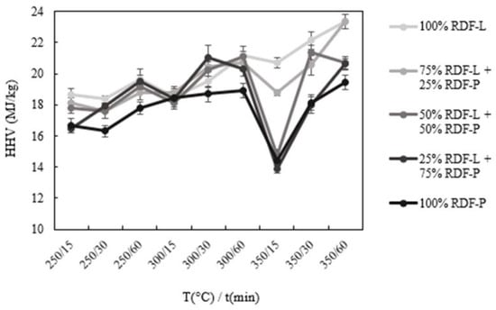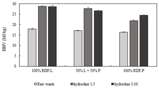 The hydrothermal carbonization process led to a significant increase in the energy density of the hydrochars, observed mainly in the RDF-L samples and the samples composed by the mixture of the two RDFs. The maximum value of energetic densification was observed in the mixed sample in the S/L ratio of 1:5 (161.4%). The increase in energetic densification explains the significant increase in the HHV of hydrochars when compared to raw wastes. The hydrochars produced from RDF-L showed HHV values around 28 MJ/kg, followed by the mixed samples (approximately 27 MJ/kg) and the RDF-P hydrochars with 22 and 24 MJ/kg in the S/L ratios of 1:5 and 1:10, respectively (Figure 10). The enhancement in HHV for hydrochars produced from RDF was also observed by Nobre et al. [44] at similar HTC conditions. Alves et al. also reported a greater improvement in the HHV of hydrochars when compared with chars at the same temperature and residence time [15].