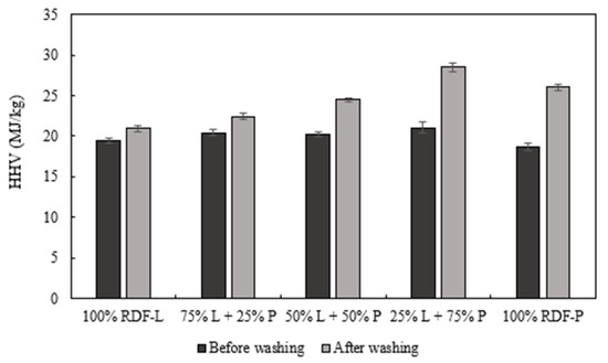 Regarding HHV, the washing process does not negatively affect this parameter, as seen in Figure 7. Moreover, after washing, the chars presented a slight increase in the HHV compared to the unwashed chars. This behavior was more pronounced in the sample with a higher incorporation of RDF-P. The higher value of HHV was observed on the sample composed of 75% RDF-P and 25% RDF-L in the unwashed chars (21.1 MJ/kg) and the washed ones (28.5 MJ/kg).