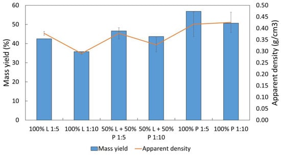 Figure 8. Mass yield (%) and apparent density (g/cm3) of the hydrochars.