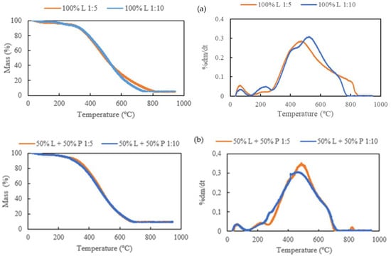 As observed in the chars, a sharper increase in mass loss took place between 200 and 500 °C in the hydrochars from RDF-L due to the total decomposition of the hemicellulose and cellulose and partial decomposition of lignin, leading to a gradual degradation of the hydrochars until 770 °C where the lignin is completely decomposed. As reported by Chen et al. [7], for a lignocellulosic biomass, the temperature zone of 30 °C to 200 °C represents only a slight weight loss due to the release of the moisture of the biomass. In the zone of 200–300 °C, the weight loss occurs gradually and represents the hemicellulose degradation. The main decomposition rate occurs at temperatures between 300 and 600 °C, where the total degradation of hemicellulose and cellulose takes places. Beyond this temperature, the decomposition rate decreases substantially, and the weight loss represents the slow degradation of lignin. The incorporation of RDF-P showed an increase in thermal resistance of the hydrochars observed after 700 °C (Figure 11b). A tiny peak was observed after 800 °C, which is more evident in the sample composed exclusively of RDF-P.