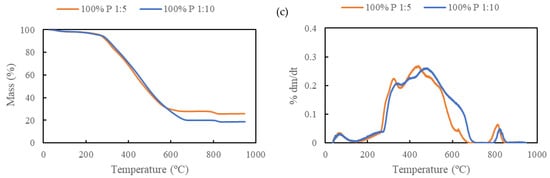 The decomposition of the hydrochars derived from the RDF-P sample occurs at the same temperature range but is less accentuated and reflects the decomposition of the polymeric fraction. A peak of degradation was observed on the hydrochars with RDF-P incorporation at 800 °C (Figure 11c), probably due to the decomposition of some fraction of plastics with higher thermal resistance [25]. Regarding the solid-liquid ratio, the influence of temperature seems to have a greater influence on the hydrochars produced at 1:10. This behavior was observed in both RDF samples and was more pronounced in the RDF-P hydrochar.