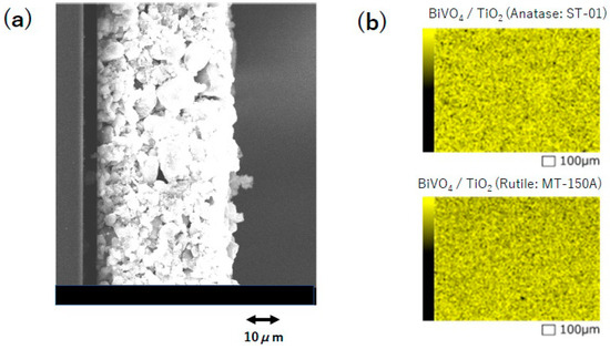 (a) Scanning electron micrograph of the cross-section of a BiVO4–TiO2 (ST-01) nanocomposite film. (b) Energy-dispersive spectroscopy (EDS) element mapping image of BiVO4–TiO2 nanocomposite films containing ST-01 (anatase, upper figure) and MT-150A (rutile, lower figure) TiO2 powders.