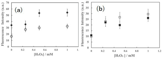 Dependence of H2O2 concentration on the fluorescence intensity of 7-hydroxycoumarin formed by the 1 h visible LED light irradiation (470 nm) of the BiVO4–TiO2 nanocomposite photocatalytic film suspended in a 0.15 mM coumarin aqueous solution. (a) Anatase form of TiO2 particles: ST-01 (●), Wako (◦). (b) rutile form of TiO2 particles: MT-150A (▪), MT-500B (□). Experiments were repeated more than three times, and the error bars for the data are also illustrated in the figure. For these experiments, the Ti/Bi ratio for the BiVO4–TiO2 nanocomposite film used was fixed at 20:1, and the excitation wavelength was set to 350 nm.