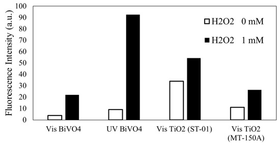 To understand the potential roles of OH radical formation through the photocatalytic reduction of H2O2 on BiVO4–TiO2 nanocomposite photocatalysts, we examined the effects of H2O2 addition on the amount of OH radicals formed on the surfaces of photocatalytic BiVO4 films mixed with several commercially available TiO2 particles (Anatase: ST-01, Wako, Rutile: MT-150A, MT-500B) under visible-light irradiation. Serpone et al. [20,30] proposed the formation of OH radicals via the photocatalytic reduction of H2O2 on the TiO2 surface. Li et al. [31] investigated the decomposition of H2O2 on TiO2 surfaces under visible-light irradiation. They observed OH radicals formed on the TiO2 surfaces by the photocatalytic decomposition of H2O2 under visible light irradiation and supported the mechanism reported by Serpone et al. [20,30]. Figure 4 shows that the amount of OH radicals increased with an increase in H2O2 concentration in the 0.15 mM coumarin solution containing the BiVO4–TiO2 nanocomposite photocatalytic film. These results indicate that OH radicals are generated during the photocatalytic reduction of H2O2 on the surfaces of BiVO4 and TiO2. It was also confirmed that the number of OH radicals increased with an increase in the concentration of H2O2, irrespective of the type of crystal phase of TiO2 (anatase or rutile) in the BiVO4–TiO2 nanocomposite photocatalytic film. These results are similar to those obtained in a previous study by Hayashi et al. [32], in which they used a visible-light-induced plasmonic Au–TiO2 photocatalyst. They also found that OH radicals were generated only in the presence of H2O2 by the visible-light plasmonic excitation of the Au–TiO2 photocatalyst. In addition, they observed an increase in the number of OH radicals in various crystal phases of TiO2 (anatase or rutile) by adding H2O2 to the Au–TiO2 plasmonic photocatalyst. From these results, they concluded that OH radicals were formed by the photocatalytic reduction of H2O2 on the surface of TiO2 by electrons in the TiO2 conduction band. These electrons migrate from the plasmonically excited Au nanoparticles. In contrast, Hirakawa et al. [33] observed a decrease in OH radical formation on the anatase form of TiO2 photocatalytic powders because of the addition of H2O2 to the TiO2 suspension. Although the reasons for such different trends—the increase or decrease in the amount of OH radicals between the photocatalytic reactions of visible-light-irradiated BiVO4–TiO2 nanocomposite or plasmonic Au–TiO2 photocatalysts and UV-irradiated TiO2 photocatalysts—have not yet been clarified, it may be attributed to the surface conditions and the presence of holes in TiO2.