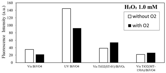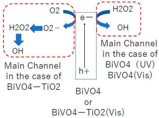 In contrast, for the visible-light-irradiated BiVO4–TiO2 nanocomposite photocatalysts, oxygen degassing decreased the amount of OH radicals. If OH radicals were formed via reaction (4), degassing oxygen would enhance OH radical formation because of the inhibition of O2− formation. Thus, for visible-light-irradiated BiVO4–TiO2 nanocomposite photocatalysts, oxygen plays an important role in OH radical formation. For BiVO4–TiO2 nanocomposite photocatalysts, OH radicals were also formed by the reaction of Equation (3). This reaction, of Equation (3), known as the Haber–Weiss Reaction [37], occurred after the photoexcitation of the BiVO4–TiO2 forming O2−. During the electron migration from BiVO4 to TiO2, photoexcited electrons might be captured in the trapped sites in the BiVO4–TiO2 nanocomposite photocatalysts, and such trapping processes in the visible-light-irradiated BiVO4–TiO2 nanocomposite photocatalysts might cause such a difference in the mechanism of OH radical formation. The results are presented in Figure 7. According to our previous study [32], the main channel for OH radical formation during plasmonic Au–TiO2-induced reduction of H2O2 is the direct photocatalytic reduction of H2O on the BiVO4 surface via the reaction channel of Equation (4).