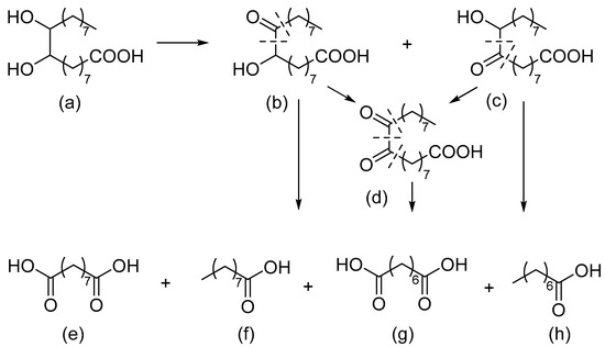 Oxidative cleavage of 9,10-dihydroxystearic acid: (a)—9,10-dihydroxystearic acid; (b)—9-hydroxy-10-oxostearic acid; (c)—10-hydroxy-9-oxostearic acid; (d)—9,10-dioxostearic acid; (e)—azelaic acid; (f)—pelargonic acid; (g)—suberic acid; (h)—caprylic acid. Reproduced from [58] with permission from the Royal Society of Chemistry.