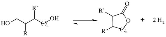 In the context of LOHC, two different schemes for diol/polyol hydrogenation cycles exist. The scheme of Figure 2 represents the formation of a lactone starting from a C4 or higher diol, for which the hydrogen storage capacity will depend on the length of the carbon chain. The one in Figure 3 represents the dehydrogenative coupling of diols to form multiple ester bonds, whose storage capacity will depend on the number of diol molecules that undergo this reaction.