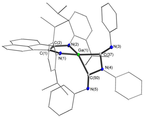 Even though the isocyanate oligomerization phenomenon under basic or reductive conditions is known [90,91], and we reported a few isocyanate transformations on the gallium center [27], most of the structures and transformations reported herein are novel. For example, complex 2 is the first metallocycloiminoacylamidine of the main group metal. Three metallocycloiminoacylamidines of the transition metals were characterized, though. They were isolated by the insertion of 2,6-dimethylphenyl isocyanide to the M–N bond of platinumazacyclopropane [(RCN)2PtC(=NR)NR)] (R = 2,6-dimethylphenyl) [92] and transformation of isonitrile in the coordination sphere of iron in the complex [Fe(dppe)(CNR)4](ClO4)2] (R = p-Tol; dppe = 1,2-bis(diphenylphosphino)ethane)) by its treatment with excess KOH [93]. Similarly, complex 3 is the second main group metal biuret to be deposited in the Cambridge Structural Database (CSD) [27]. Isocyanate oligomerizations were reported to give six-member metallacycles on nickel [94], palladium [95], and chromium [96] centers. To the best of our knowledge, the generation of compounds with five-membered metallacycle MC(=NR)C(=O)O, like in complex 5, is also unprecedented.