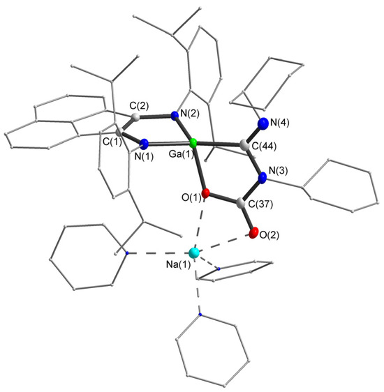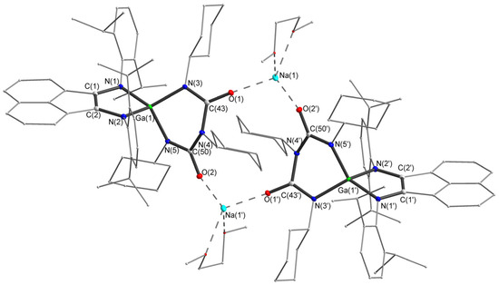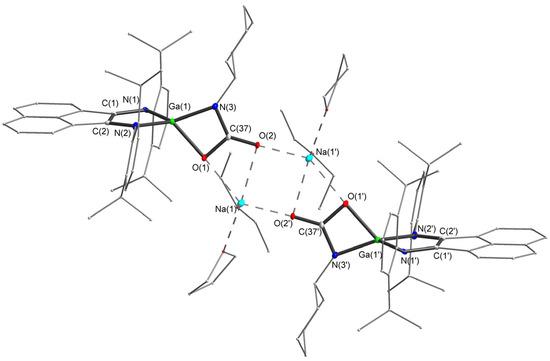 In the crystal, molecules of 3 presented by species dimerized through sodium cations and placed on the crystallographic center of symmetry (Figure 3). Distances O(1)–C(43) (1.2397(18) Å), O(2)–C(50) (1.2448(18) Å) are close to each other and correspond to a double C=O bond. The C–N bonds (N(3)–C(43) (1.3352(19) Å), N(5)–C(50) (1.3436(19) Å) are averaged between C=N (1.27 Å) and C–N (1.46 Å), probably due to conjugation with C=O bonds. Interatomic distances N(4)–C(50) (1.4174(19) Å) and N(4)–C(43) (1.4300(19) Å) in turn fall into the range typical to single C–N bonds. Interatomic distances corroborate those of N,N’,N”-triphenylbiuret [105]. Complex 4, like 3, is a dimer in a crystal state (Figure 4). Interatomic distance O(2)–C(37) (1.239(6) Å) corresponds to a double C=O bond, while the distances O(1)–C(37) (1.345(6) Å) and N(3)–C(37) (1.366(6) Å) correspond to single C–O and C–N bonds. Similar four-member metallacycles MNCO were previously reported on aluminum [75]. Admittedly, structures 3 and 4 are reminiscent of reaction products of 1 with 1 equiv. of CO2 and 1 equiv. of PhNCO or CyNCO [(dpp-bian)GaN(Cy)C(O)N(Cy)C(O)O]2[Na(DME)2]2 and [(dpp-bian)GaN(Ph)C(O)O]2[Na(DME)2]2, respectively [87].