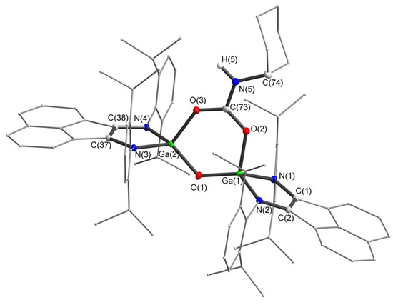Crystals of 8 suitable for XRD analysis were obtained by recrystallization from C6D6 (Figure 6). Bonds lengths in carbamate fragment O(2)–C(73) (1.2744(19) Å), O(3)–C(73) (1.2759(19) Å) are approximately equal and in good agreement with phenanthroline–carboxylate gallium complex (C(30)–O(5) (1.269(12) Å) and C(30)–O(6) (1.272(11) Å)) [109]. The gallium oxide bridge geometry is similar that of 6. The sum of the angles at the C(73) is approximately 360°, which indicates its sp2-hybridization.