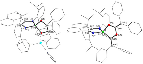 The molecular structure of products 9 and 10 is shown in Figure 7. They consist of galladioxolene metallacycles. Bonds within the metallacycles (O(1)-C(37) 1.4184(15), O(2)-C(50) 1.4377(15), C(37)-C(50) 1.6408(18), Ga(1)-O(1) 1.8310(9), Ga(1)-O(2) 1.8654(9) Å in 9 and O(43)–C(44) 1.313(6), O(45)–C(44) 1.370(6), O(45)–C(46) 1.408(6), Ga(1)–O(43) 1.921(4), Ga(1)–C(46) 1.978(5) Å in 10) are in perfect agreement with expected values (C–C 1.52, C–O 1.42, C(sp2)–O 1.39, Ga–O 1.88, Ga–C(sp2) 1.95 Å) derived from corresponding covalent radii [110]. Compared to 9, the metallacycle in 10 is almost flat; the deviation of atoms from this plane is less than 0.033 Å. The sum of the angles at the carbon atoms C(44) and C(46) in 10 is approximately 360°, indicating their sp2-hybridization. Bond lengths C(44)–C(66) (1.372(8) Å) and C(46)–C(47) (1.333(8) Å) correspond to double C=C bonds (1.34 Å). Pinacolate fragments can be compared with similar complexes, for example, aluminum pinacolate [LAl(OCPh2)2] (L = HC[(CMe)(NAr)]2, Ar = 2,6-i-Pr2C6H3) [98]. Comparison of metallacycle in 10 is limited to germanium cycloadduct [LGeC(Ph)OC(Ph)O] (O(1)–C(21) 1.416(2) Å, O(2)–C(21) 1.433(2) Å, O(2)–C(28) 1.435(2) Å) [111], and the titanium complex [(Cp)2TiC(=CPh2)OC(=CPh2)O)] (O(1)–C(11) 1.36(2) Å, O(2)–C(11) 1.33(2) Å, O(2)–C(13) 1.42(2) Å) [100].
