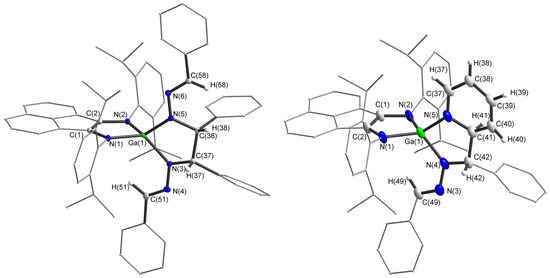 Compounds 2–6 are diamagnetic and produce resolved NMR spectra. Complexes of dpp-bian that have symmetry elements produce a characteristic pattern of the ligand NMR [87]. Likewise, the NMR spectra of a solution of 2 contain a simplified set of signals due to two symmetry planes. Eight methyl groups and four methine groups of iPr are presented by two doublets (δ 0.75, 0.89 ppm, 12H each) and one septet (3.74 ppm, 4H), respectively. Protons of the phenyl group produce signals at 7.56 (2H), 7.25 (2H), 7.01 (4H), 6.78 (4H), 7.06 (1H), and 6.57 (2H) ppm. The GaC(NPh)N carbon atom produces a signal at 152.8 ppm that is similar to 158.1 ppm of azacyclobutane C(=NPh)C(Me2)N(Ph)C(=NPh) [89]. Compounds 3 and 4 were characterized only by XRD analysis because of very close solubilities. The NMR spectrum of complex 5 demonstrates a simplified signal set due to a symmetry plane. Protons of the methyl and methine groups of iPr give four doublets (6H each) and two septets (2H each). Protons of the naphthalene part appear as two doublets (2H each) at 6.29 and 7.12 ppm and one doublet of doublets (2H) at 6.86 ppm. Protons of methylene groups cyclohexyl substitutes give six multiplets at 2.79 (2H), 1.89 (2H), 1.70 (4H), 1.57 (4H), 1.37 (4H), and 1.18 (4H) ppm. Protons of the methine groups produce two broad singlets (1H each) at 4.82 and 3.54 ppm. Compound 6 is poorly soluble in ether solvents, aggravating its NMR identification. The 1H NMR spectra of 6 exhibited two doublets (24H each) at 0.96 and 0.86 ppm and one septet (8H) at 3.77 ppm for the protons isopropyl group indicative of three symmetry planes. The reactions from Scheme 3 seem to be unselective; NMR-scale experiments resulted in untrackable mixtures of products.