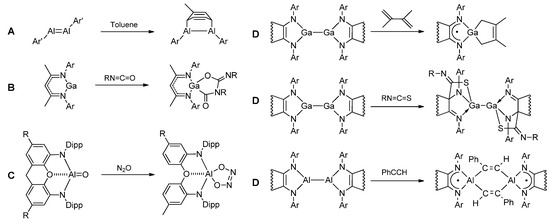 Despite structural and electronic differences, all the aforementioned metallylenes can undergo cycloadditions [55]. Dialumenes, reminiscent of olefins (Scheme 2, A), unveil their intriguing propensity for [2+2] cycloaddition reactions with an array of substrates—ranging from CO2 [56], olefins, and alkynes [57,58] to unactivated benzene rings [59,60]. Gallium terphenyl dimetallene ArGaGaAr (Ar = 2,6-terphenyl) was reported to react under ambient conditions with ethylene, propene, 1-hexene, and styrene to give 1,4-digallacycloalkanes [61].