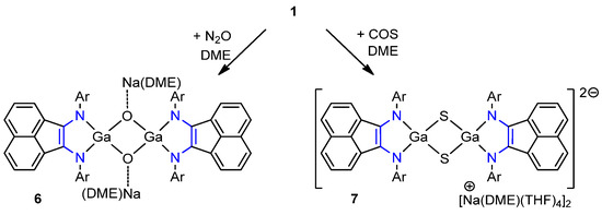 Formation of 2–5 can be rationalized through the mechanism suggested earlier for the reaction of 1 with O=C=O [87]. It anticipates the formation of intermediate adduct INT[GaRNCO] (Scheme 3). The reaction is followed by the [3+2] or [3+2+2] cycloaddition of a second and a third molecule of isocyanate with concomitant extrusion of isonitrile or CO. Moreover, the intermediate INT[GaRNCO] is supposed to have two competitive decomposition pathways to the oxide INT[GaO] and the imide INT[GaNR], which are unstable towards dimerization [87]. According to the proposed mechanism, the generation of species 2 should have led to a noticeable amount of INT[GaO], which was well supported by an experiment. A deeper inspection of the reaction mixture of 1 with PhNCO allowed the isolation of green crystals of an INT[GaO] dimer, the gallium oxide [(dpp-bian)GaO]2[Na(DME)2]2 (6), on top of crystals of complex 2. The relatively low isolated yields of 2–5 may be attributed to the existence of few energetically close intermediates INT[GaO], INT[GaNR], INT[GaRNCO] along with the presence of competitive reaction pathways that, in fact, resulted in a mixture of similar products. Complex 6 was also synthesized by the direct reaction of gallylene 1 with 1 equiv. N2O (Scheme 4) as green crystals in 66% yield. Spectral characteristics of 6 from both experiments coincided. For the sake of 6 synthesis, compound 1 was also treated with 1 equiv. carbonyl sulfide. That, however, resulted in sulfide 7 as green crystals in 35% yield.