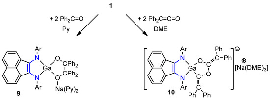 To better understand the reactivity of 1 against C=O-containing compounds, it was treated with 2 equiv. of benzophenone or 2 equiv. of diphenylketene. Green crystalline products [(dpp-bian)GaO(CPh2)2O][Na(Py)2] (9) (53% yield) and [(dpp-bian)Ga{C(=CPh2)O}2][Na(DME)3] (10) (22% yield) were isolated from the reaction mixtures, respectively (Scheme 6).