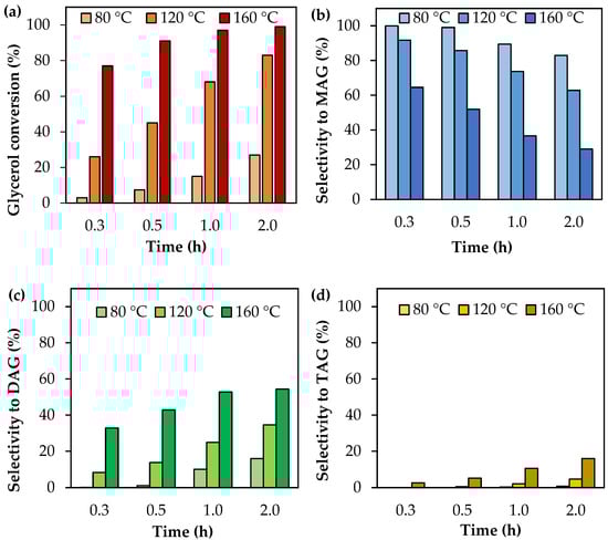 Activity tests as a function of time using analytical-grade glycerol. (a) Glycerol conversion. (b) Selectivity to MAG. (c) Selectivity to DAG. (d) Selectivity to TAG. Reaction conditions: 80–160 °C, AA/G = 6, P = 2 MPa N2 initial pressure.