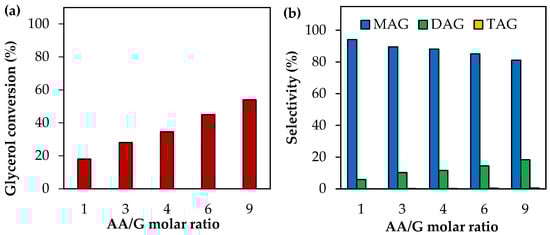 Activity tests as a function of the AA/G molar ratio using analytical-grade glycerol. (a) Glycerol conversion. (b) Selectivity to MAG, DAG and TAG. Reaction conditions: 120 °C, 0.5 h, P = 2 MPa N2 initial pressure.
