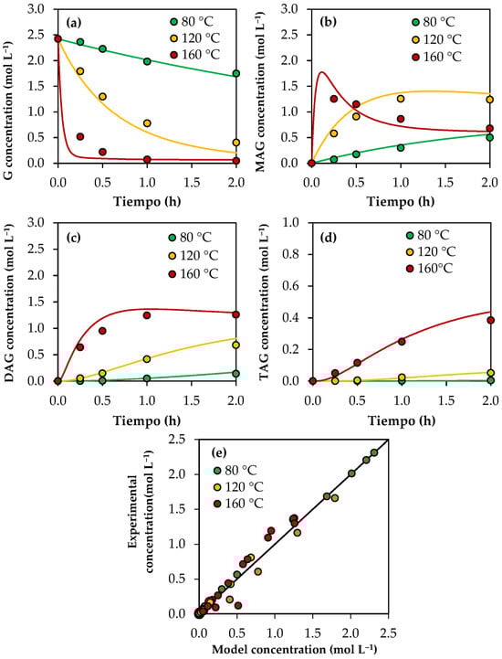 Results of the kinetic model using analytical-grade glycerol. (a) Glycerol concentration as a function of time. (b) MAG concentration as a function of time. (c) DAG concentration as a function of time. (d) TAG concentration as a function of time. (e) Experimental concentration vs. model concentration in a parity plot. Reaction conditions: 80–160 °C, AA/G = 6, P = 2 MPa N2 initial pressure.