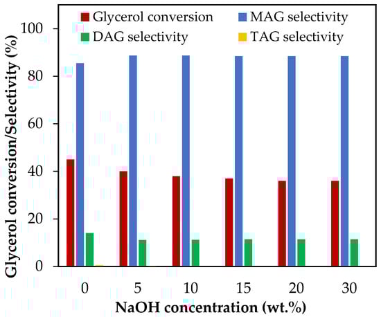 The effect of NaOH addition was evaluated between 5 wt.% and 30 wt.%, which corresponds to NaOH/glycerol molar ratios between 0.11 and 0.69. The results are presented in Figure 7.