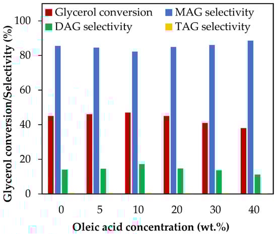 Figure 9 shows the results of adding oleic acid as a test molecule for evaluating the effect of MONG in the range of 5–40 wt.%, which corresponds to MONG/glycerol molar ratios between 0.01 and 0.13. As can be seen from the results, no changes in glycerol conversion nor in selectivity to liquid products were observed up to 20 wt.% oleic acid, which corresponds to a MONG/glycerol molar ratio equal to 0.06. When the oleic concentration exceeded 20 wt.%, glycerol conversion decreased from 45% to 38%, and liquid product selectivity experiments revealed a slight variation, following the acetylation mechanism. This would indicate that MONG may play a role in the catalytic activity of acetylation just in cases of high concentration levels.