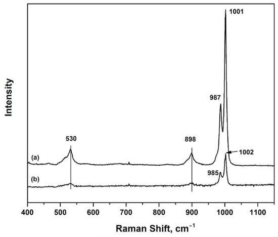 Raman spectroscopy was applied to study the structure of Cs2.5H0.5PW12O40. Figure 2 shows the characteristic Keggin structure with bands located at 530 cm−1, 898 cm−1, 985 cm−1, and 1001 cm−1 [18,19]. The lower wavelength bands, 530 cm−1 and 898 cm−1, were assigned to the W-Ob-W bridge between corner-sharing octahedra, and the W-Oc-W bridges between edge-sharing octahedra, respectively [18]. The bands at 985 cm−1 and 1001 cm−1 were attributed to symmetric and asymmetric W = Ot within WO6 octahedra [19]. These characteristic bands were observed with the fresh catalyst and the catalyst after three cyclic tests. Although the intensities of the Raman bands decreased in the samples after three reusability tests, Raman spectra confirmed that the structure of heteropoly acids was maintained. This explains why the activity did not drop after three test runs.