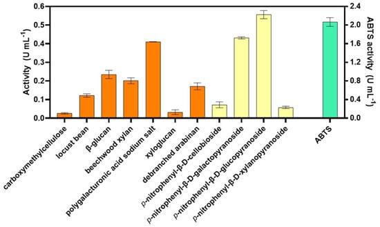 Enzyme activities (U mL−1) for the tested substrates. Orange bars indicate activities assayed with natural substrates. Yellow bars indicate activities assayed with synthetic substrates. The green bar indicates activity assayed with ABTS (data plotted on the right Y-axis). Error bars indicate mean ± standard deviation.