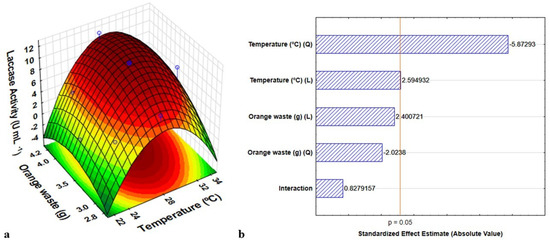 The scientific literature presents orange waste media as an inducer of laccase production by filamentous fungi [41,49]. A Pareto diagram of effects and a contour surface graph were plotted. The contour plot demonstrated the highest enzymatic activity at the 0-level for temperature (28 °C) and 1.41-level for orange waste (4.2 g) (Figure 2a), and the quadratic and linear temperature effects were statistically significant (Figure 2b). The culture in the optimized orange waste medium resulted in 11.625 U mL−1 of laccase activity. This represents an increase of 5.6-fold when compared to the previously obtained laccase activity (2.066 U mL−1).