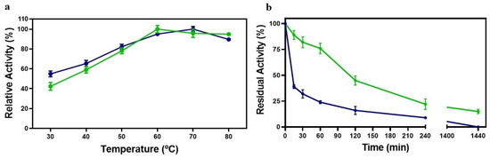 Optimum temperature (a) and thermostability (b) for the T. hirsuta enzymatic extracts containing laccase. (●) Crude extract laccase; (●) immobilized crude extract laccase. Thermostability was evaluated at the optimum temperature: 70 °C for the crude extract (CE) and 60 °C for immobilized crude extract (ICE).