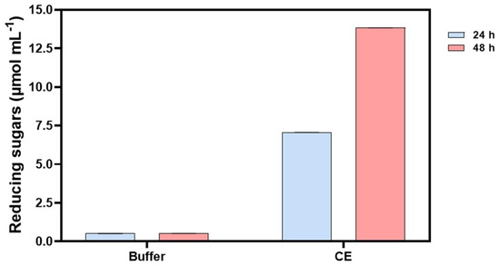 The CE was used to hydrolyze sugarcane bagasse for 24 and 48 h. After 24 h and 48 h, 7.06 ± 0.05 μmol mL−1 and 13.83 ± 0.02 μmol mL−1 of reducing sugars were released, respectively (Figure 6). A similar result was observed with immobilized laccase. This indicates that the immobilization process of T. hirsuta laccase for application in sugarcane bagasse hydrolysis is unnecessary due to the similar results obtained from applying crude extract directly. However, the immobilization of laccase is more stable and could offer a positive outcome in saccharification with more extensive time. Further studies would be interesting for better biochemical knowledge of the protein structure and the modeling of laccases since several were identified in the genome of fungi from the Trametes genus. In-depth biochemical studies, including techniques such as X-ray crystallography, nuclear magnetic resonance (NMR) spectroscopy, and molecular dynamics simulations, could reveal fundamental details about the structural conformation of laccase, the binding sites of substrates and cofactors, and the electron transfer pathways [66]. Not all are studied in this context. Additionally, it is possible to suggest that the complementation of crude extracts with enzymes or enzymatic extracts from other non-basidiomycete fungi would be an exciting strategy, and the use of enzymatic extracts from T. hirsuta could also be an attractive strategy to improve lignocellulosic biomass hydrolysis, revealing its potential for application in the biofuels industry, especially in the production of bioethanol from the breakdown of plant biomass into fermentable sugars, since multiple cellulases, hemicellulases, and ligninases acting together might reach better results [67,68,69].