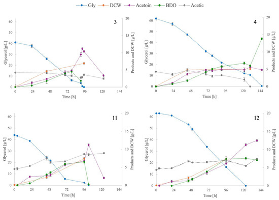 Kinetics of glycerol (Gly), dry cell weight (DCW), acetoin, 2,3-butanediol (BDO), and acetic acid concentrations during shake-flask batch culture. Numbers 3, 4, 11, and 12 represent the trials in Table 2.