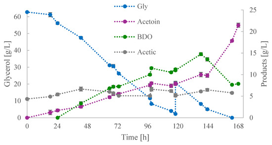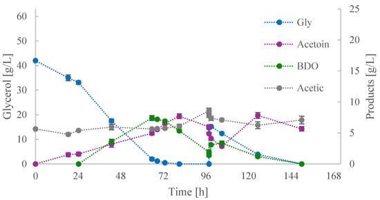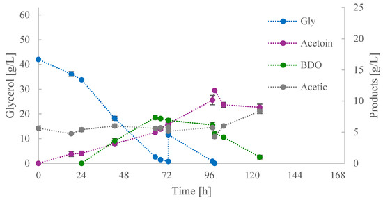 The difference between the conditions of rows 3 and 4 was the level of Gly0 employed. For the Gly0 of 40 g/L, acetoin was the major product throughout the culture and peaked when glycerol was depleted, reaching 11.2 g/L. In this case, the YACTN/Gly (0.28 g/g) was the highest of the values presented in Table 2. Conversely, for Gly0 of 60 g/L, BDO became the major product after ~75 h and peaked at the point of glycerol and acetic acid depletion. This phenomenon has not previously been observed in this study. BDO reached a concentration of 13.8 g/L, which is the highest in Table 2. The ConRate was slightly higher for the Gly0 of 40 g/L (0.57 g/g) compared to that of 60 g/L (0.49 g/g). In rows 5 and 6 of Table 2, only 50% of ComOrg was used, which resulted in very low concentrations of both acetoin and BDO, as both were less than 2 g/L, as well as an extended culture duration. The ConRate of both Gly0 employed was also lower, namely 0.27 g/g and 0.37 g/g in each case.