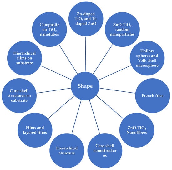 The synthesis could be obtained by a single-step reaction only for the simpler shapes, such as Zn-doped TiO2 and Ti-doped ZnO, ZnO-TiO2 random nanoparticles, hollow spheres, French fries, and nanofibers; moreover, some of these shapes have been synthesized with alternative methodologies. In Scheme 2, the synthesis method used to prepare these simpler shapes is shown.