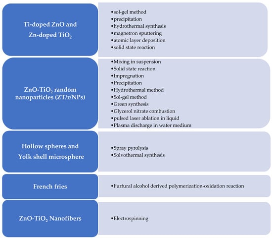 ZnO-TiO2 nanocomposites (ZTNCs) have been proposed in most applications already tested for pure ZnO nanoparticles (ZNPs) and TiO2 nanoparticles (TNPs), in order to improve performances of the pristine oxides. ZTNCs may present very differentiated structure and properties because of the combination of different allotropic phases of both oxides and the coexistence of different allotropic phases of the same oxide. Synthesis methodologies and strategies have been explored to give rise to a large variety of shape, structure and composition. The availability of different chemical, physical and hybrid synthesis methodologies, combined with the possibility of modifying numerous process variables, make it possible to obtain materials with different structural characteristics, such as crystalline structure, morphology, particle size, energy gap, and surface area, which give very diversified properties, and therefore possibilities of applications for the material itself. All synthesis methods usually use high temperature as a final treatment, and this can potentially lead to the formation of titanium–zinc mixed oxide: cubic spinel zinc orthotitanate (Zn2TiO4) [6,7], zinc metatitanate (ZnTiO3) [6] as the hexagonal ilmenite [7] or cubic perovskite [8,9] and the cubic Zn2Ti3O8 [7]. Moreover, Zn may migrate into the TiO2 crystal lattice and, vice versa, and Ti can migrate into the ZnO crystal lattice. This last aspect is specifically faced only in certain studies in the calculation of the lattice parameters, but most of time it is neglected.