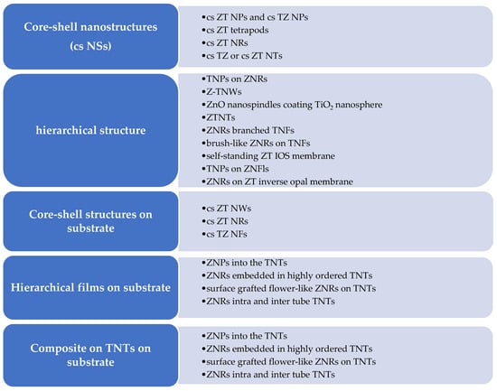Appropriate synthesis strategies for more complex shapes, such as core–shell nanostructures, hierarchical structures, hierarchical films on substrate, and composites on titanium dioxide nanotubes, include two or more stages. Furthermore, these shapes often include several sub-shapes, and a simple schematization of the methodologies used is not possible. Scheme 3 shows some of the sub-forms included in the more complex shapes already listed, while the description of the methodologies used is faced in the Synthesis Section.