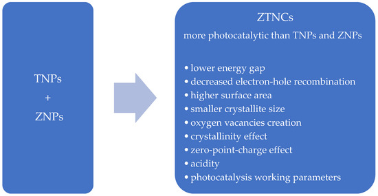 Factors influencing the increased photocatalytic effect of ZTNCs compared to TNPs and ZNPs.
