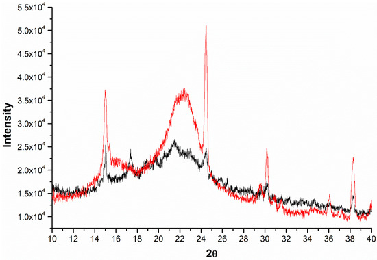 X-ray diffraction diagram for untreated sisal residue (black line) and sisal residue pretreated with sulfuric acid and sodium hydroxide (red line).