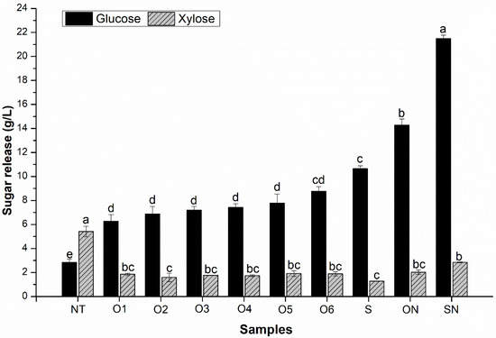 The enzymatic hydrolysis of UT generated only 2.85 g/L glucose and 5.42 g/L xylose (Figure 2). This result can be explained by the fact that the lignocellulosic matrix is still organized and has a high content of extractives. In addition to reducing the availability of sugars, extractives can have adverse effects on the action of cellulases [36]. Therefore, after removing extractives and other amorphous components, a tendency for a greater sugar release was observed in the pretreated samples. Xylose release was reduced in experiments with acid-pretreated samples due to the removal of hemicellulose. In turn, glucose release more than doubled. Enzymatic hydrolysis of samples O1 and O4 generated 6.27 and 7.44 g/L glucose, respectively. The highest average glucose concentration among samples pretreated with oxalic acid (8.76 g/L) was also in the most severe condition, sample O6.