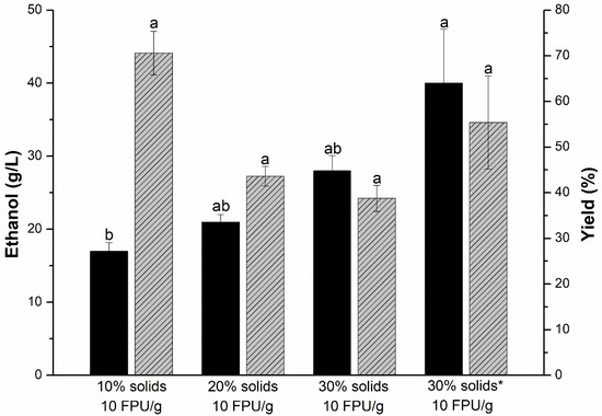 Ethanol production (black bar) and ethanol yield (gray bar) after SSSF of SN sample. The experiments were carried out under the following conditions: pre-saccharification at 50 °C and 120 rpm for 8 h, final cellulase of 10 FPU/g, S. cerevisiae PE-2 inoculum of 108 cells per mL, fermentation temperature of 40 °C, and final incubation time of 56 h (8 h of pre-saccharification + 48 h of fermentation). The symbol * represents that the addition of solids and cellulases was carried out gradually. Equal lowercase letters mean no significant differences between responses of the same type. The Tukey test was used with a significance level of 5% (p < 0.05).