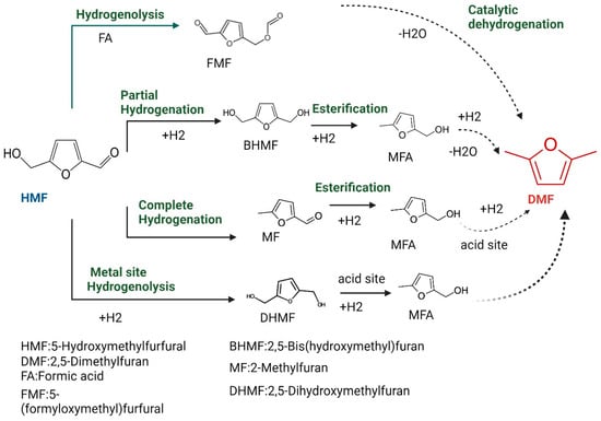 - Nishimura, S.; Ikeda, N.; Ebitani, K. Selective hydrogenation of biomass-derived 5-hydroxymethylfurfural (HMF) to 2,5-dimethylfuran (DMF) under atmospheric hydrogen pressure over carbon supported PdAu bimetallic catalyst. Catal. Today 2014, 232, 89–98. [Google Scholar] [CrossRef]
