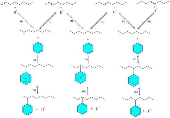 Understanding the origin of the reactivity of zeolite materials necessitates the development of the molecular-level understanding of the structure and chemical nature of catalytic centers [57]. A network of elementary steps involved in the alkylation of benzene and toluene with octenes over solid acid catalysts was developed, as shown in Figure 1 and Figure 2, respectively [43,44,48]. With benzene responding from the “liquid phase” and olefins reacting as adsorbed species on the catalyst’s surface, the reaction network’s underlying mechanism is of the Eley–Rideal type. Adsorbed benzene molecules are not regarded as reactive species in the suggested mechanism because contact with an acid site reduces the electrical density on the aromatic ring, making an electrophilic assault more challenging. Eley–Rideal-type methods for the alkylation of benzene over large pore zeolites like Y and beta have previously been postulated [58].