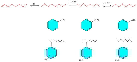 This reaction network is based on carbenium–ion chemistry, which is thought to happen on the catalyst surface [39,43]. If not, the widely known process involving the creation of an alkylcarbenium ion by the interaction of the olefin with the acid catalyst may be used to explain the synthesis of these products from benzene or toluene and 1-octene. In most situations, this step determines the pace at which the thus-formed carbocation attacks the aromatic ring and generates an arenium ion, or so-called sigma complex. The last step involves the sigma complex removing the hydrogen linked to the attacked aromatic carbon as a proton, resulting in the creation of the final alkylated product and catalyst renewal. Given that the production of the 1-phenyl-isomer would require the highly active creation of a primary carbenium ion, this mechanism explains why it is absent from the reaction products.
