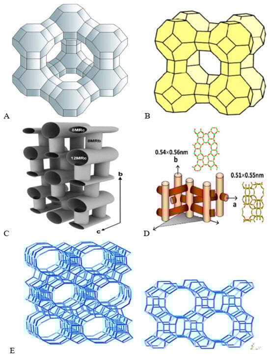 The framework structures (A) Y, (B) A, (C) mordenite, (D) ZSM-5, and (E) beta zeolite catalysts, adapted from [99,100,101,102,103].