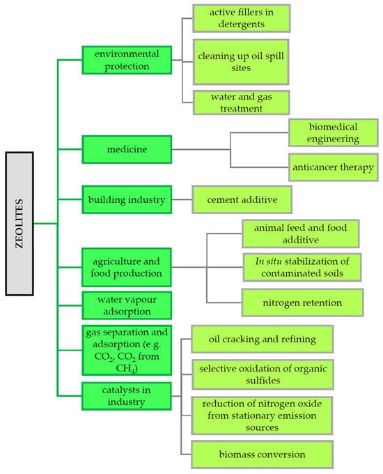 Zeolites, as microporous materials, have unique physicochemical properties and a unique structure, making them widely used in many modern scientific and industrial fields (see Figure 4) [132].