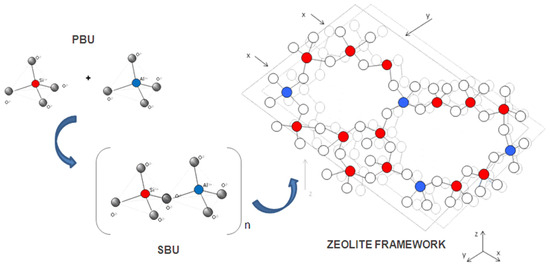 Extra-framework species and a host framework make up a typical zeolite. Despite the fact that all zeolites are constructed from TO4 tetrahedra (where T can be any of the following: Si, Al, or P), they connect to form various forms of tetrahedral frameworks in distinct ways [136,137]. A collection of primary building units (PBUs) that are created by merging secondary building units (SBUs) make up the zeolite framework structure [103]. As seen in Figure 5, the final ones are formed by Al or Si atoms joined by four oxygen atoms.