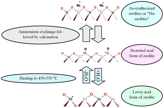 Alkali metal ions are frequently added to zeolite syntheses in order to balance the framework’s charge [66]. Without a doubt, the zeolites cannot function as a catalyst in their current state and can be converted to a protonic form in order to accomplish the intended result. While protons can be used to directly replace the alkali metal, the optimal solution is thought to include substituting ammonium ions for the alkali metal. As seen in Figure 6, the resultant ammonium ions are next heated to 500–600 °C to drive off ammonia and create the proton [82].