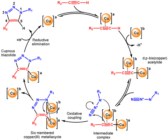 - Worrell, B.T.; Malik, J.A.; Fokin, V.V. Direct Evidence of a Dinuclear Copper Intermediate in Cu(I)-Catalyzed Azide-Alkyne Cycloadditions. Science 2013, 340, 457–460. [Google Scholar] [CrossRef]